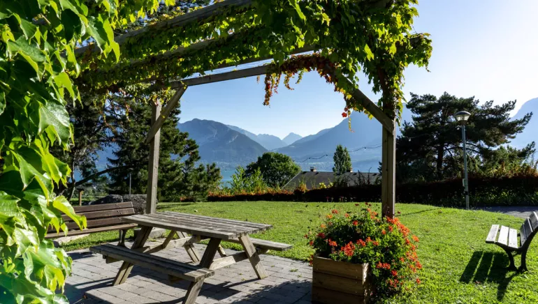 10 minutes from Annecy, overlooking the lake and its mountains, 150 bedrooms, 3 dining rooms, 1 terrace overlooking the lake, 13 meeting rooms, landscaped park and outdoor pool.