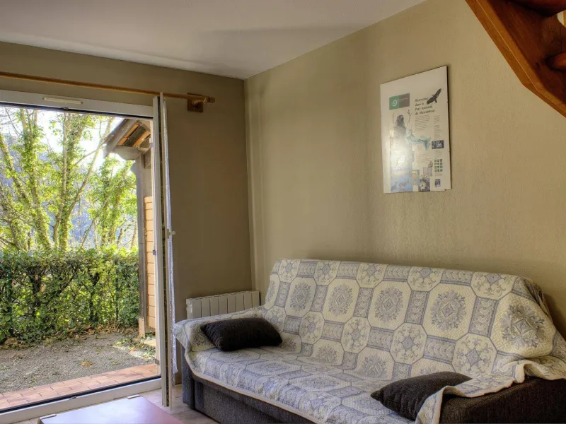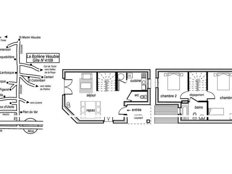 Stay at the foot of an Alpine village in the Vésubie valley, Mercantour surrounded by chestnut and larch trees. Set of 8 adjoining communal gîtes located in the Puey district. Ideal for meeting up with several families or friends while maintaining privacy by reserving several gîtes. The Gîte Héliotrope is located at one end of this complex and adjoining the Gîte Géranium (4108). Leisure park nearby, shops and swimming pool (in summer) in the village. The Col de Turini road (12km) and its numerous bends are famous in the automobile world. In fact, every year in January the Monte Carlo Rally organizes one of its specials there. 15km away, many activities await you in summer and winter at the Camp d'Argent station, and particularly around the Authion massif. 12km also to reach the spa resort of Berthemont les Bains.Héliotrope duplex gîte. Ground floor : Covered entrance-porch. Living room with kitchen area 23 m2 with 1 sofa bed (140x190), TV with indoor antenna. Independent WC.