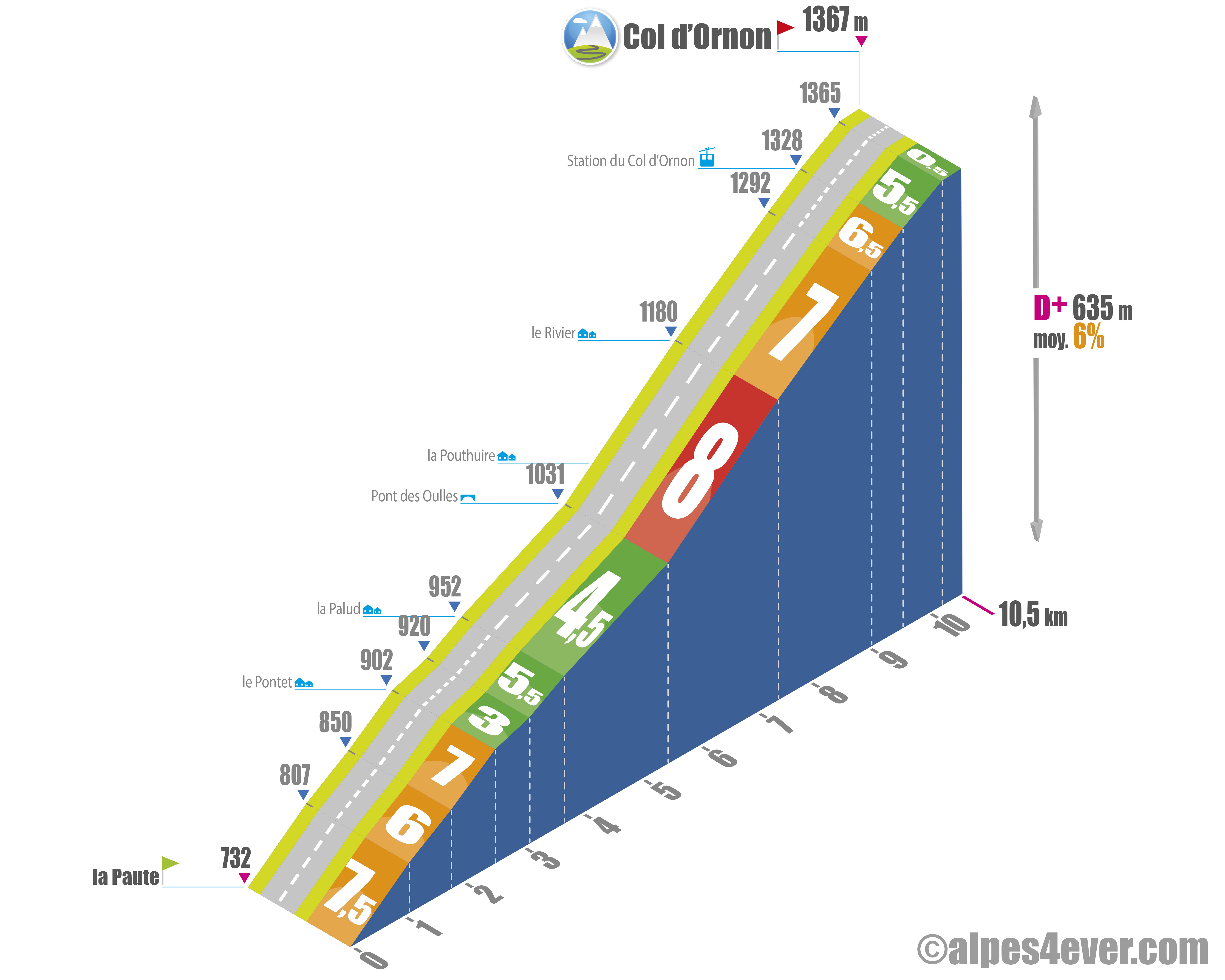 De eigenlijke beklimming begint bij La Paute, net na Bourg d'Oisans, voor een klim van ongeveer 10,5 km. Hoewel de afstand bescheiden blijft, is het profiel tamelijk onregelmatig, met een gemiddeld stijgingspercentage van 6%, stevig genoeg om de benen een training te geven.