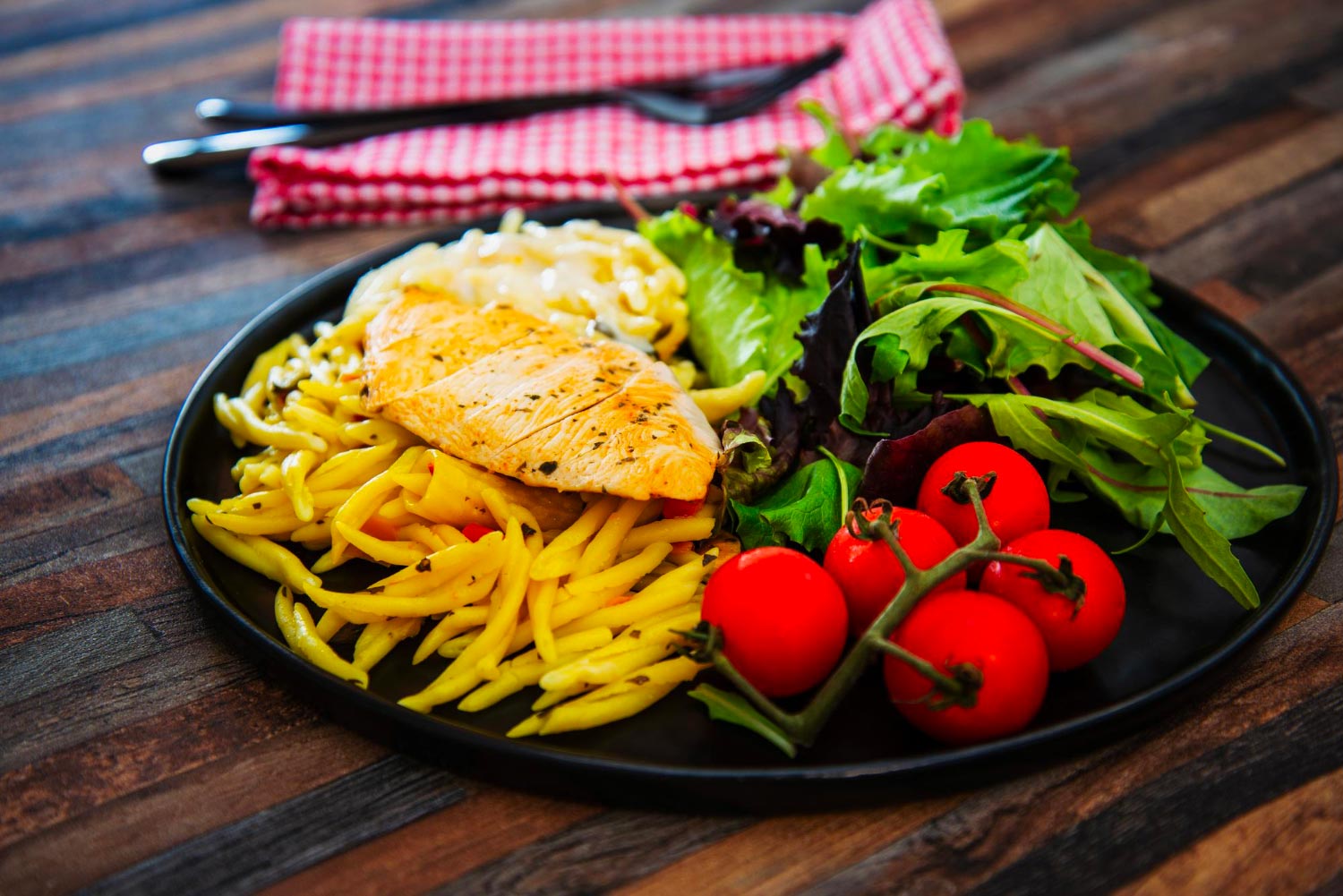- 25% de protéines maigres : poulet, poisson ou lentilles