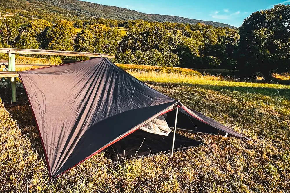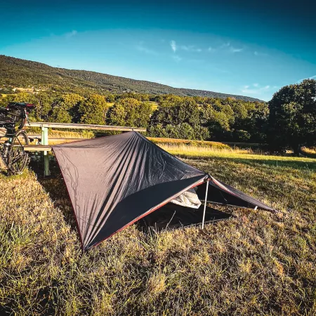 Le tarp est une variante pour les approches bike packing minimalistes. Attention, il n'a pas de structure. Il faut prévoir de l'attacher à son vélo ou entre deux arbres. Nous recommandons de tester son installation avant de partir.